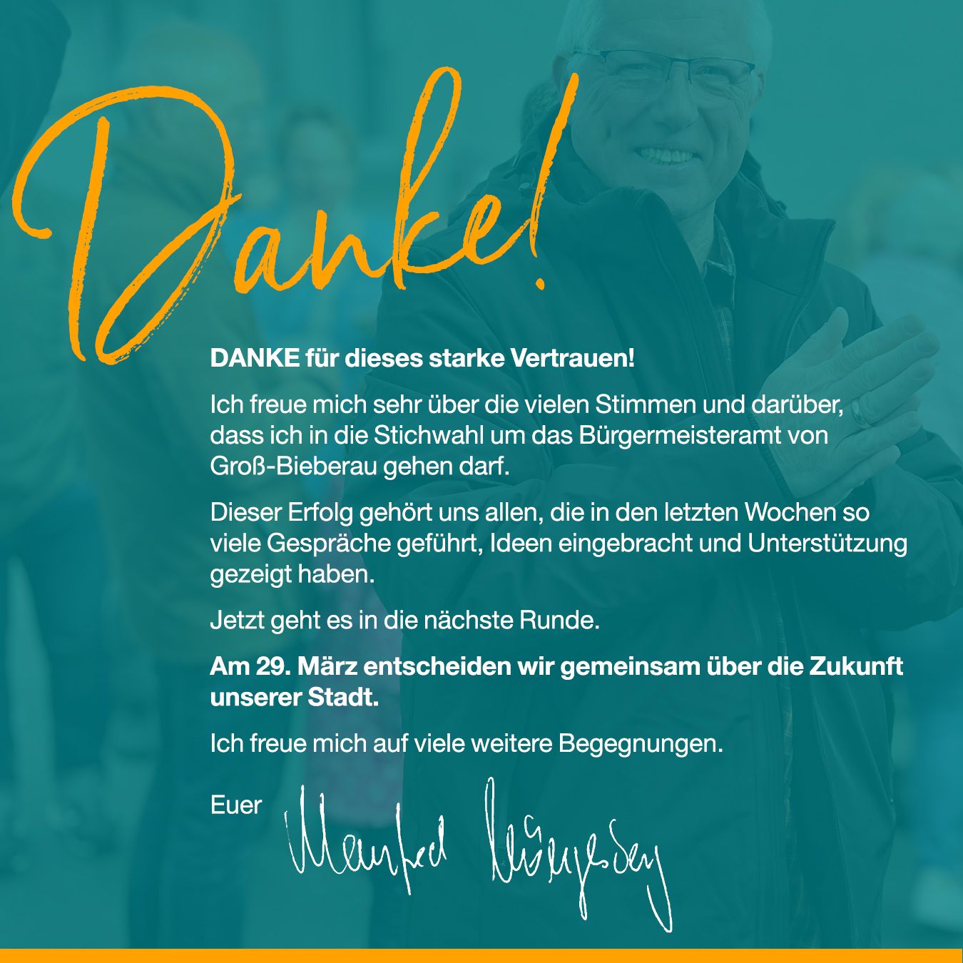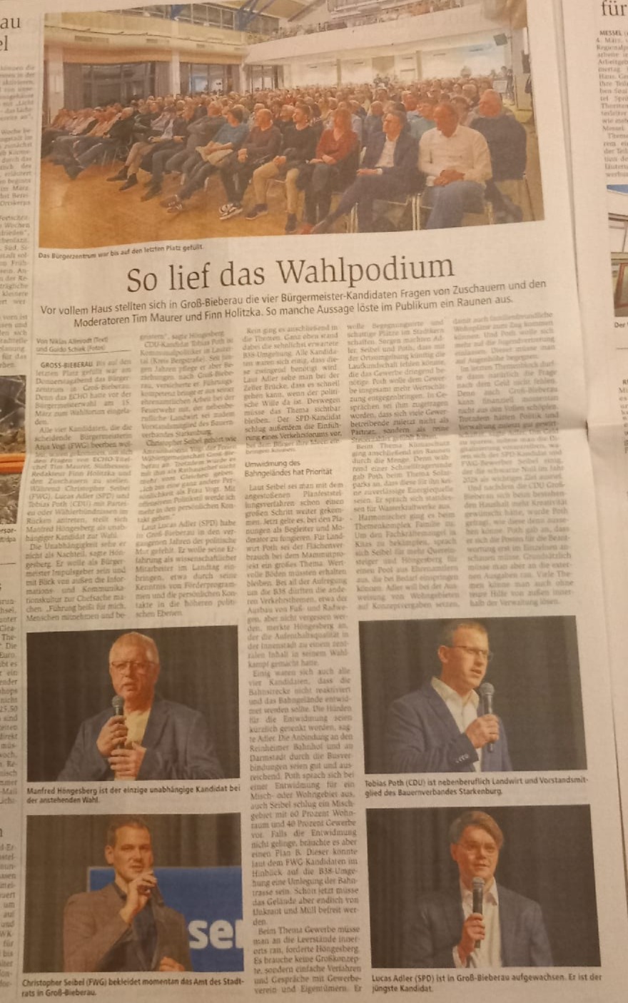 DANKE für dieses starke Vertrauen! Ich freue mich sehr über die vielen Stimmen und darüber, dass ich in die Stichwahl um das Bürgermeisteramt von Groß-Bieberau gehen darf. Dieser Erfolg gehört uns allen, die in den letzten Wochen so viele Gespräche geführt, Ideen eingebracht und Unterstützung gezeigt haben. Jetzt gehen wir gemeinsam in die nächste Runde. Am 29. März entscheiden wir gemeinsam über die Zukunft unserer Stadt. Ich freue mich auf viele weitere Begegnungen. Gehen Sie am 29.03. wählen oder nutzen Sie die Briefwahl! Für unser Groß-Bieberau. Geht nicht? Gibt’s nicht!