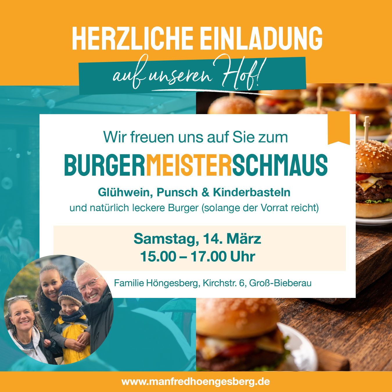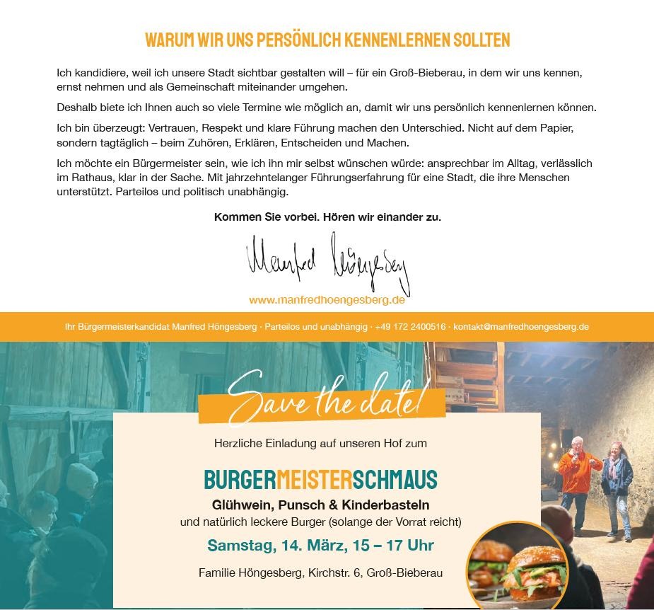 Fast 300 verspeiste Burger, jede Menge gute Laune und richtig gute Gespräche – quer durch alle Generationen – beim BURGERmeisterSCHMAUS. Ich hatte Groß-Bieberau zu uns nach Hause auf unseren Hof eingeladen – und es war einfach schön zu sehen, wie viele gekommen sind. Genau so stelle ich mir unsere Stadt vor: miteinander, offen und mit Lust, etwas zu bewegen. Davon wollen wir jetzt mehr 😊 Jetzt haben wir die Chance, diesen Weg konsequent weiterzugehen: Stichwahl am 29. März. Ich freue mich auf viele weitere Begegnungen – und über Ihr Vertrauen. Gehen Sie am 29.03. wählen oder nutzen Sie die Briefwahl! Für unser Groß-Bieberau. Geht nicht? Gibt’s nicht!