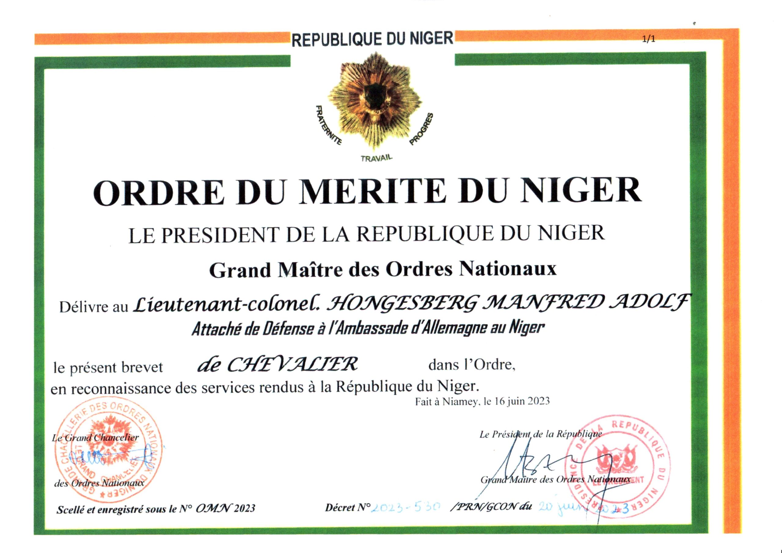 • Ausgezeichnet mit dem „Ordre du Mérite du Niger“ für besonderes Engagement